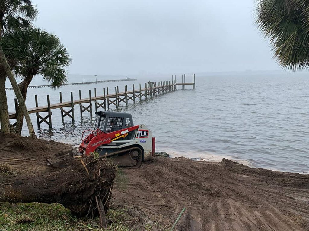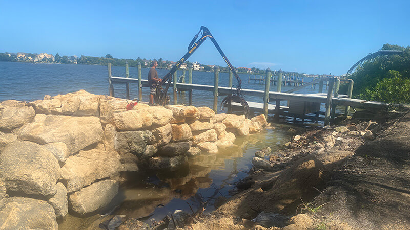 Land-based installation is the standard approach for many contractors. This involves driving heavy equipment—like excavators and loaders—directly onto your property to move coquina rock and materials to the water’s edge.